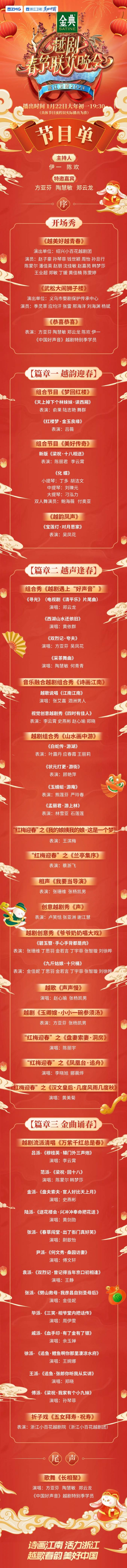 晚会由浙江省文化和旅游厅联合出品,新华网客户端、人民日报视界客户端、广电总局“视听中国”全媒体矩阵、中国蓝新闻客户端、浙江卫视视频号、中国蓝TV 同步直播;中国视听APP、美丽浙江矩阵、浙里文化圈同步分发;浙江广播电视集团海外中心(国际频道)、now jelli紫金国际台1月26日(大年初五)重播。