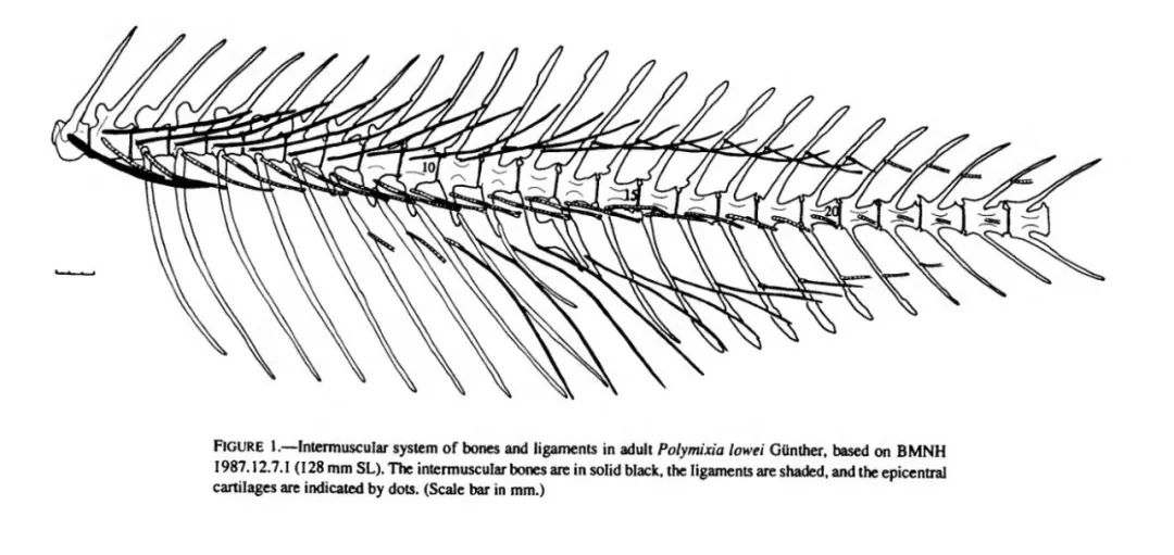 深黑色部分为肌间刺。图片来源:Patterson C, Johnson G D.The intermuscular bones and ligaments of teleostean fishes[J]. Sm ithsonian Contribution toZoology, 1995, 559:1-85.不过,科学家发现,随着鱼类的演化,鱼的肌间刺经历了一个从少到多,又从多到少,最后消失的过程。从某种程度上也可以说,“这些有小刺的鱼都不怎么高级”。