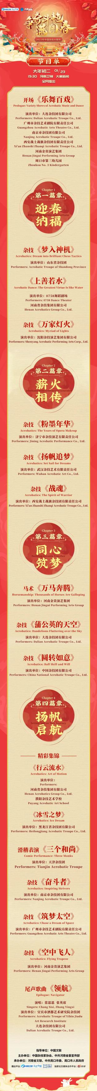 2023年杂技大联欢以“争奇斗艳满园春”为主题,分“迎春纳福”“薪火相传”“同心筑梦”“扬帆启航”四个篇章。