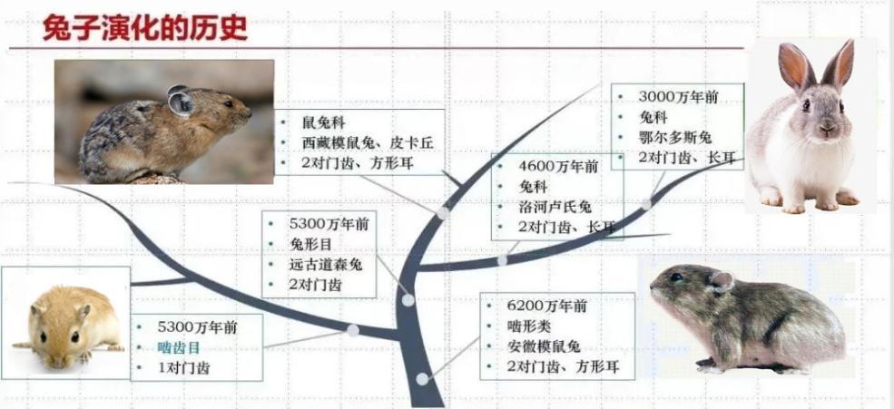 “兔”的进化史兔子和老鼠看起来非常相似。现代生物分类学的创始人、瑞典科学家林奈把兔子和老鼠归于啮齿类,但事实上,它们在系统发生和身体结构上有很多差异,这是两类沿着完全不同的独立道路平行发展的动物。中科院古脊椎动物与古人类研究所的李传夔先生1977年在安徽潜山发现了兔形类的祖先——模鼠兔,并命名为安徽模鼠兔,这是全世界迄今发现最早的兔形动物,生存时代为距今6200万年的早古新世,由此确认了模鼠兔是鼠和兔的共同祖先。