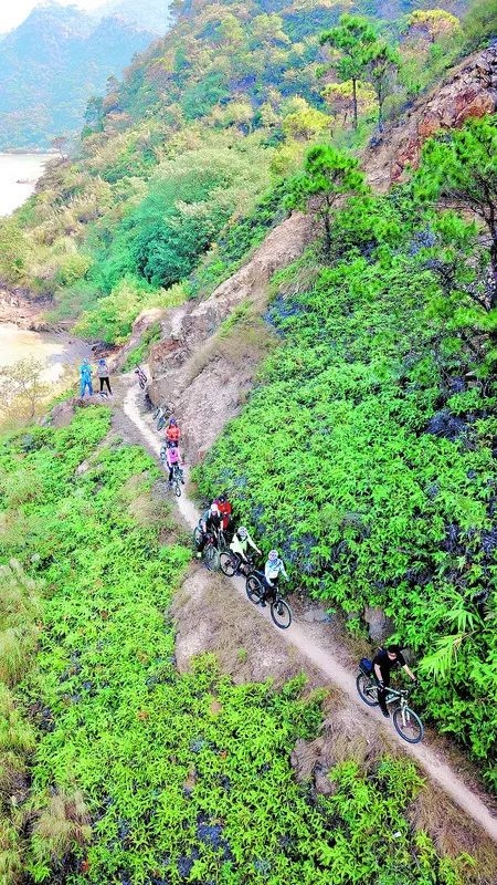 下田村到虎坑有数公里,这个过程才真正考验骑行者。最险的一段紧靠西江,路宽0.5至1米,脚下是悬崖,江水汹涌,右侧是陡峭山峰。不少刚入门的骑行者,见到这个阵仗就吓坏了,连推车也要小心翼翼。但对于有一定经验的骑行者,这样的路段就很好玩,凭着技术和胆量,轻松穿越。