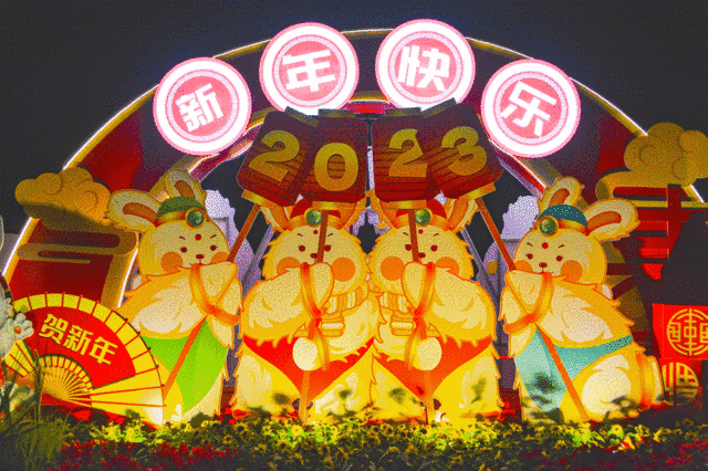 夜幕降临之时,在映月湖公园亲水平台,这组春花争艳、张灯结彩的新春灯饰等你来打卡。六只可爱的瑞兔,恭祝市民朋友2023新年快乐。