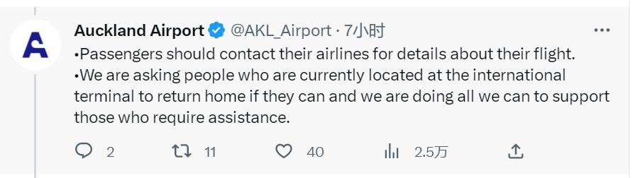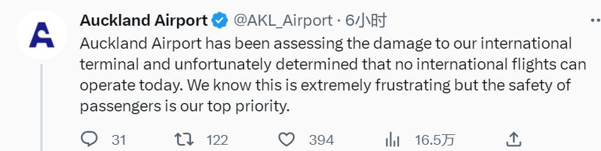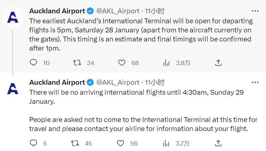 奥克兰机场当地时间28日在推特发文表示,机场最早会在当日下午5点对离境航班开放。奥克兰机场还表示,当地时间29日凌晨4:30前将没有国际航班抵达。奥克兰机场补充表示,国际候机楼最早将于1月28日星期六下午5点开放离港航班(目前在登机口的飞机除外)。