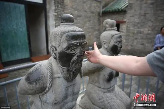 图为河南淮阳游客岳飞观里冒雨“打秦桧”。中新网资料图。据报道,近日,河南一景区游客排长队打秦桧雕像。还有游客,用鞋子抽打雕像。