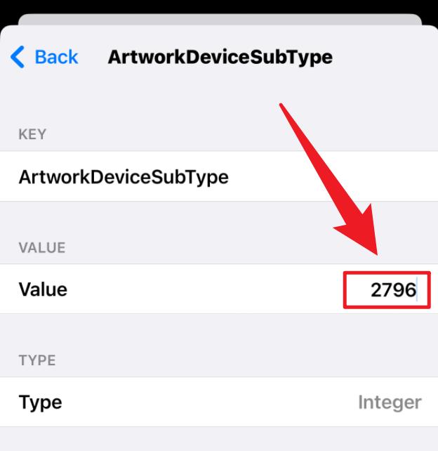 选择 cacheExtra,搜索 oPeik,然后再选择 ArtworkDeviceSubType,把里面的 Value 值改成 2796,返回上一页点击 Done( 注意修改前记得截图保存初始值 ):