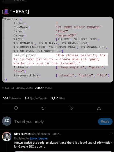 Yandex不是以搜索引擎起家,常被称作“俄版百度”/“俄版谷歌”嘛,那就先以搜索引擎部分的代码为例。一位名叫Alex Buraks的老哥就深扒了下Yandex搜索引擎的排名规则,还戏称这对理解谷歌SEO(搜索引擎优化)有很多有用的信息。