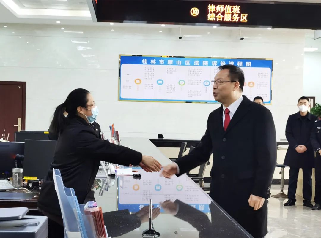 杨晓春院长及李强书记一行在雁山区法院党组书记、院长刘红星,党组成员、副院长梁小超的陪同下,来到诉讼服务中心,与工作人员一一握手,并亲切询问工作开展情况,对干警们一年以来立足本职、践行司法为民宗旨的奉献精神、兢兢业业地辛苦付出以及取得的成绩表示肯定和感谢,并希望他们在新的一年里继续发扬优良作风,再接再厉,再创佳绩。