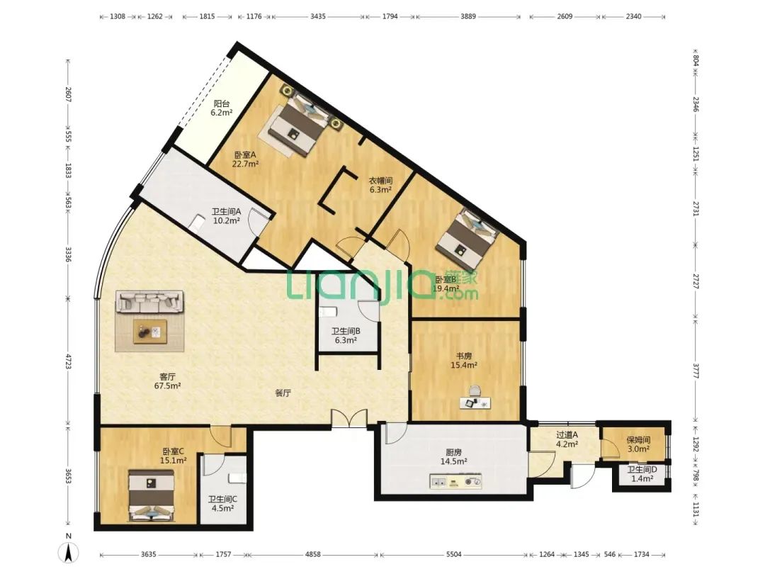 来源:链家有的虽然功能区是方正的,但整体造型多少有点离谱,导致空间布局上线条很多,不少边角面积都浪费了