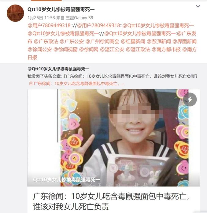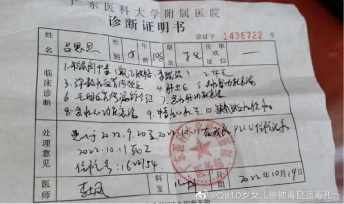湛江市12345回复家属反映的问题近日,有网友在微博上发文,《10岁女儿吃含毒鼠强面包中毒死亡,谁该对我女儿死亡负责》。