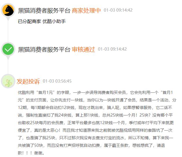 小北介绍道,当下大部分的视频会员均可以随时购买或者退订,即便选择了连续包月选项,也可按照自己的需求在任何时间暂停自动续费。以腾讯视频为例,30天VIP的常规收费为30元,连续包月则可以减少为25元,但在提前中止连续包月计划的情况下,这5元的差价也并不会扣除,“更不用说是在完全不知情的情况下参与了活动,签订了所谓的‘协议’。”小北补充道。而在黑猫投诉平台上,同样认为优酷存在虚假宣传及诱导消费的用户更不在少数:据该平台统计,12月针对优酷“1元会员”的投诉就有近400单。