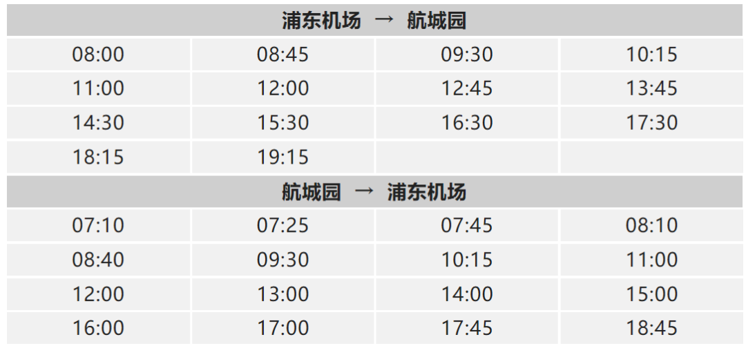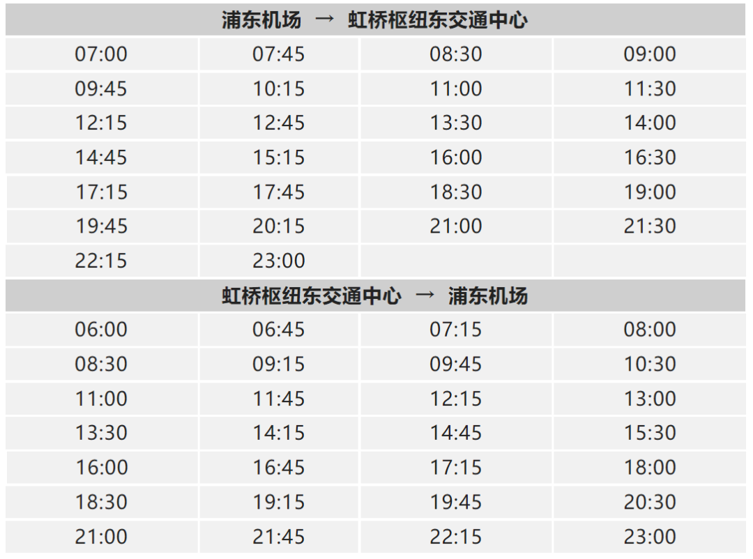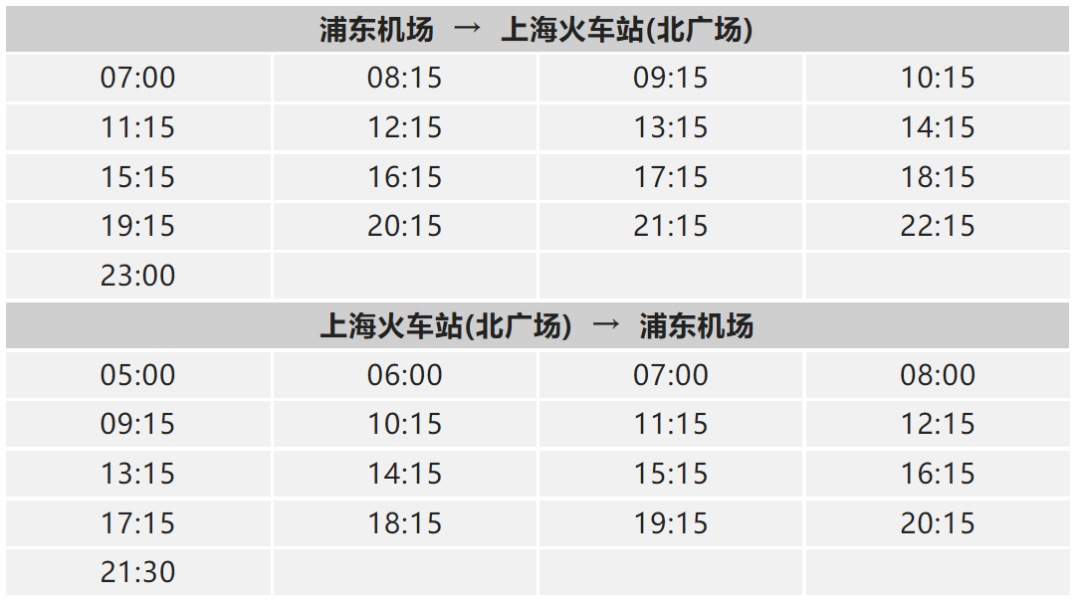 温馨提示:以上发车时刻表仅供参考,可拨打服务热线电话021-22351888进行咨询。如遇特殊情况,发车时间会有微调,以现场发车时间为准,敬请谅解;