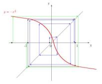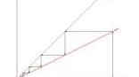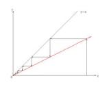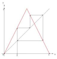 首先作出映射y = S(x)的图像,然后在坐标轴的对角线y = x上找到坐标为(x0,x0)的点,它代表了迭代的初始值。然后从那个点出发向上或向下沿着竖线走,一直走到和映射的图像相交为止,在交点处向左或向右转弯沿着横线走,一直走到和对角线相交为止,这个交点就代表着第一个迭代点x1。然后从这点向上或向下沿着竖线走,一直走到和映射的图像相交,在交点处向左或向右转弯沿着横线走直到和对角线相交,这个交点则代表着第二个迭代点x2。如此走下去,我们就依次得到对角线上代表迭代点x0,x1,x2,x3,x4,x5,…… 的一个点列。