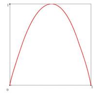 所以它也是一个混沌映射。当自变量x限制在单位区间[0,1]上,它的图像是在单位正方形[0,1]2中“顶天立地”的抛物线: