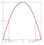 的演示,可以知道[0,x]在S下的逆像 S-1([0,x])是两个区间[0,(1-√(1-x))/2] 和[(1+√(1-x))/2,1]的并集,故由上述的公式得PSf(x) = [(1-x)-1/2/4]{f((1-√1-x)/2) + f((1+√1-x)/2)}。