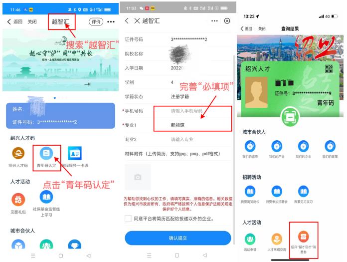 (2)在校大学生:登录“浙里办”APP—搜索“越智汇”进入越智汇,选择“青年码认定”,完成认定后选择越智汇首页“绍兴人才码”进行申领。