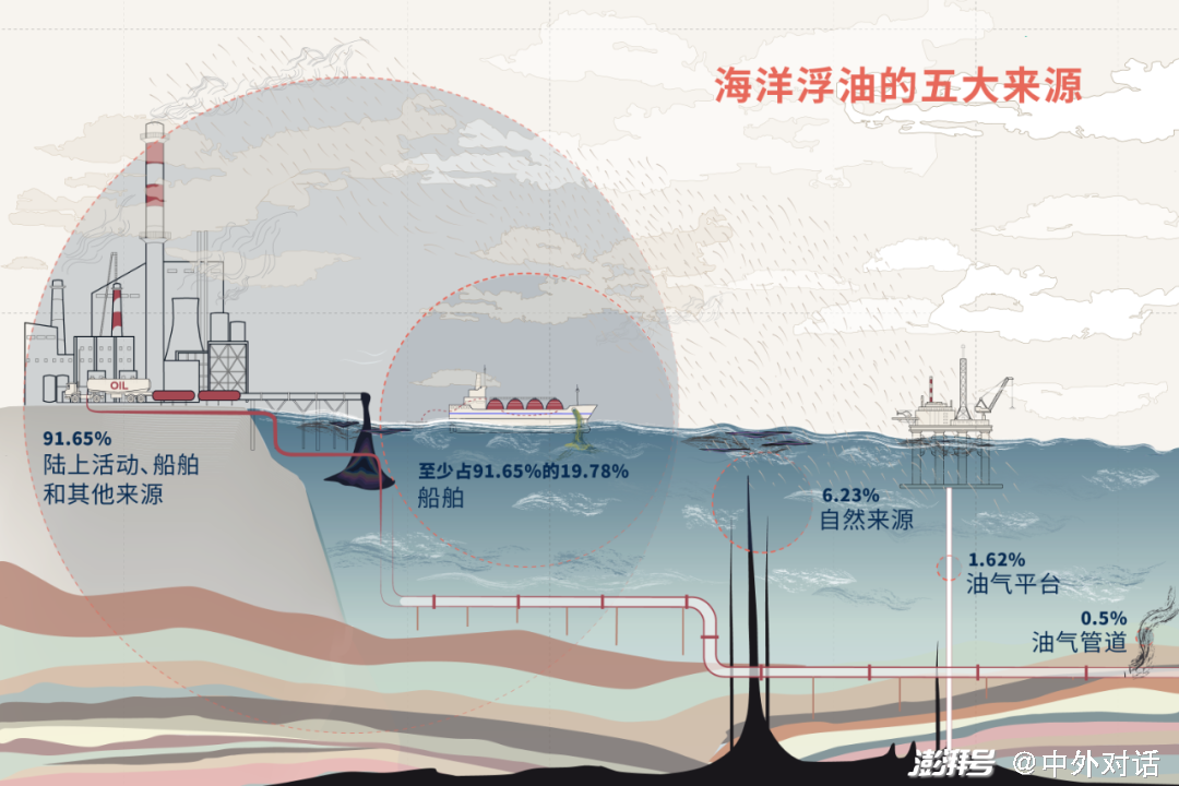 海洋浮油分为自然来源和人为来源。前者指的是原油从海底下方的地质层通过裂缝释放出来的自然渗漏过程,就像泉水从地下涌出来一样。其释放速度足够低,以至于周围的生态系统可以适应它们,甚至在它们的存在下茁壮成长。人为来源主要来自船舶、海上油气平台、海底油气管道和陆地排放。