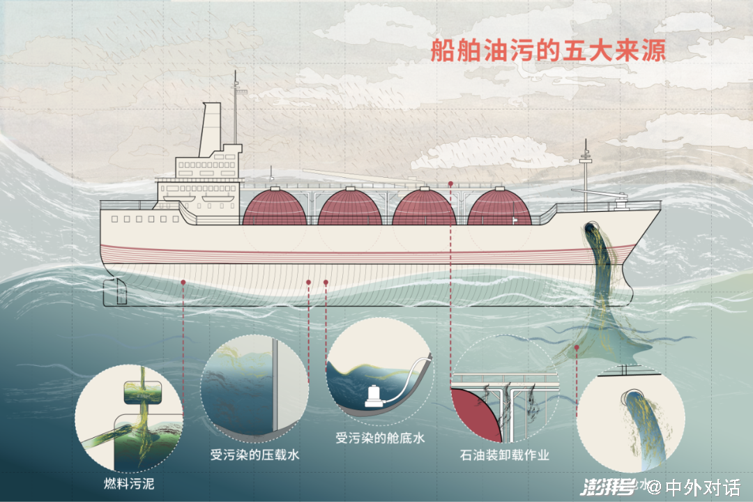 油轮的污染则较为特殊。除了装载、卸载和加油作业的少量漏失,油轮卸完原油后,会将油槽装满海水作为“压舱水”以维持回程的船身平衡,之后再抽出排入海中。不过,这只发生在小型船舶上,当今大多数油轮(载重量2万吨以上的原油运输船和载重量3万吨以上的成品油船)须设置专用压载水舱。此外,当油轮更换运油的品种(如由装载原油改成燃料油)或进坞修理时,需要用水洗掉舱内的残油,从而产生了含油浓度非常高的“洗舱水”。