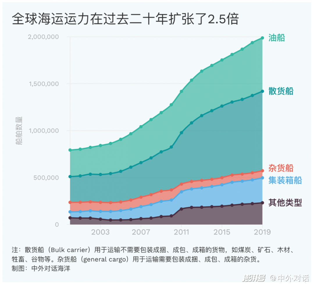 在航运繁忙海域,研究首次观测到21条与航线高度吻合的高密度浮油污染带,并指出,船舶排放的浮油面积至少是自然来源的三倍。这一发现与全球运输业的迅速发展不无关系,2000年至2019年,全球海运运力扩张了2.5倍。