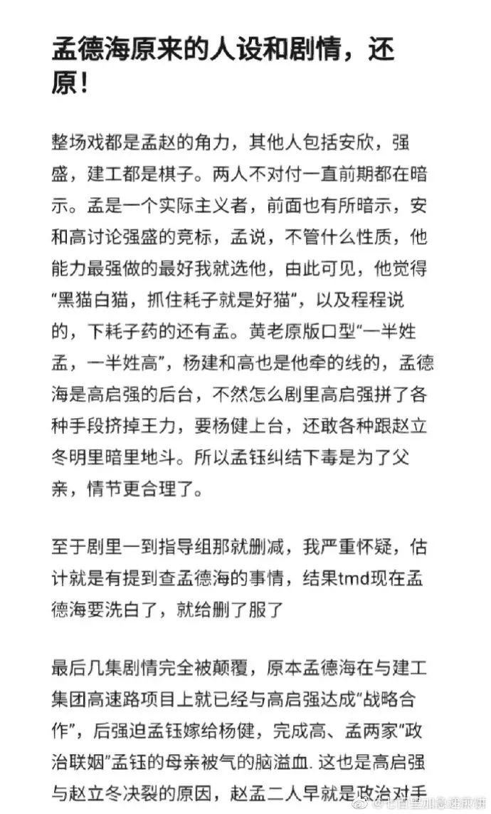 观众将剧情混乱归结于后期的剧本改动,并努力读唇语对口型,试图找回原本的走向。因为这关系着重要任务“孟德海”是白还是黑,是大义灭亲的好书记,还是黑社会的保护伞。