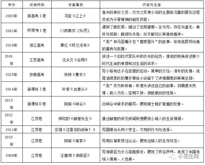 高考语文江苏卷之前特别喜欢选择这种类型,我感觉现在全国卷也有这个趋势。给大家看一张表,是近年来高考中出现 “诗化小说” 阅读理解文章的统计。