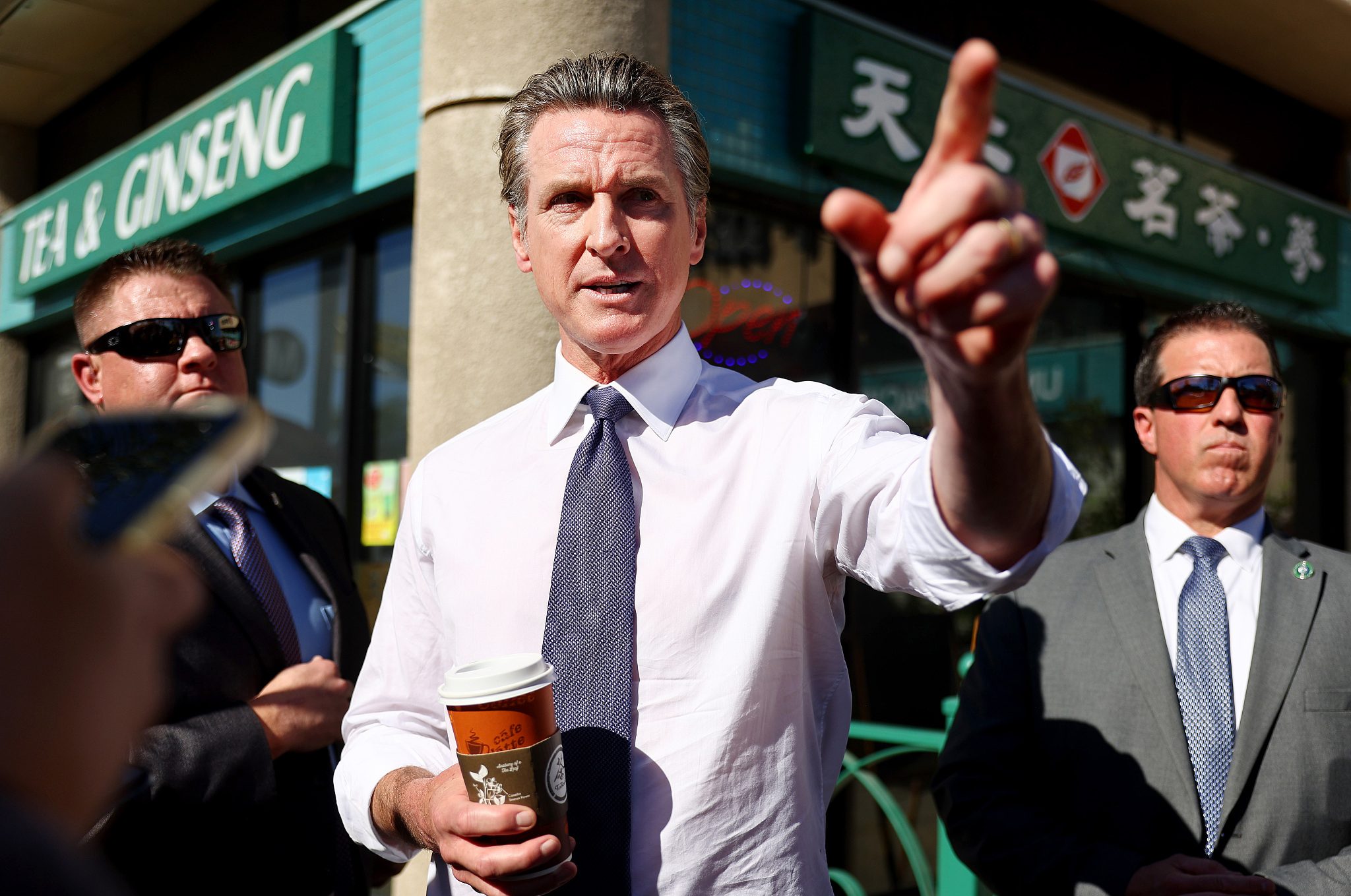 当地时间2023年1月23日,美国加州蒙特雷帕克市,美国加州州长加文·纽瑟姆在发生在歌舞厅的大规模枪击现场附近对媒体发表讲话。