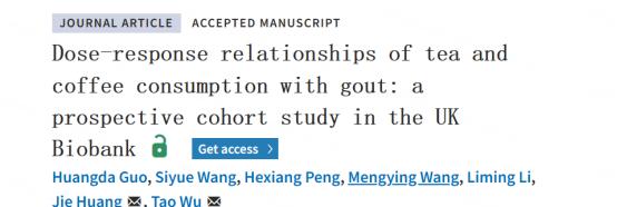 [1]Huangda Guo, Siyue Wang,et al.Dose-response relationships of tea and coffee consumption with gout: a prospective cohort study in the UK Biobank[J].Rheumatology.https://doi.org/10.1093/rheumatology/kead019