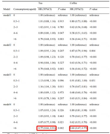 研究人员将茶和咖啡的摄入量分为以下几类:0、0.5-1杯、2-3杯、4-6杯和> 6杯/天,并研究了每一类与痛风风险的关系。