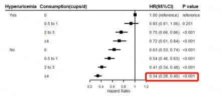 此外,该研究还测试了咖啡、高尿酸血症和痛风之间的关联(图2)。有趣的是,与不喝咖啡的高尿酸血症患者相比,喝咖啡≥4杯/天且无高尿酸血症的参与者患痛风的风险最低(HR 0.34,95% CI 0.28-0.40)。