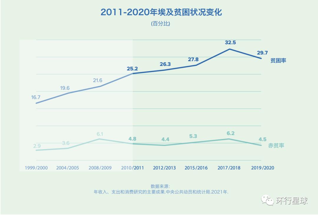 埃及中央统计局抽样调查表明,家庭规模越大贫困率越高,人口数5人以上的家庭有一大半处于贫困线(按每月收入30美元)以下。近年来埃及的贫困率伴随着人口膨胀节节攀升,两者相互关联形成了一个怪圈:“越穷越生、越生越穷”。