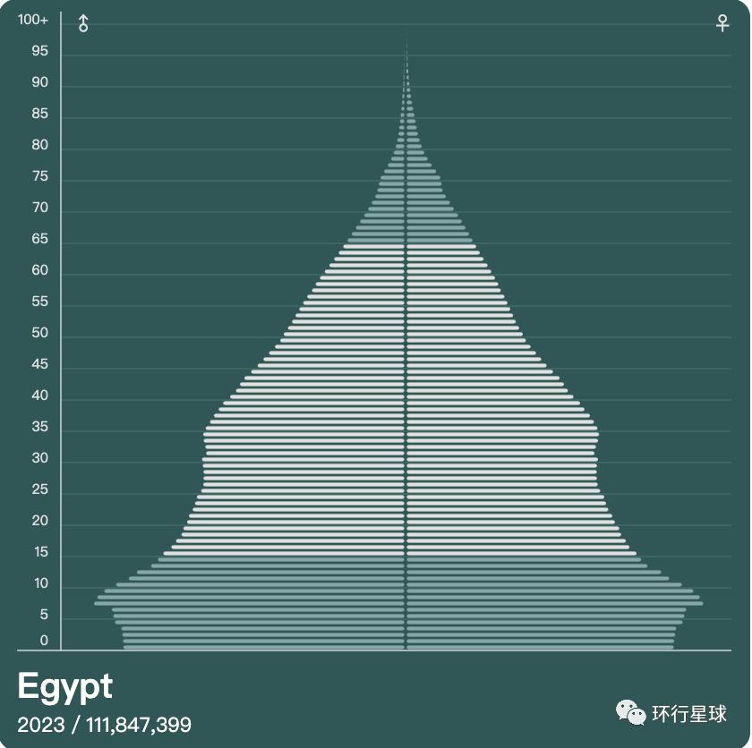 埃及的人口金字塔十分类似真正的“古埃及金字塔”,2022年埃及人口金字塔显示,0-15岁低龄组比重最大,往高龄组逐渐缩小,这是典型的扩张型人口结构,预示着埃及未来进一步的人口膨胀。