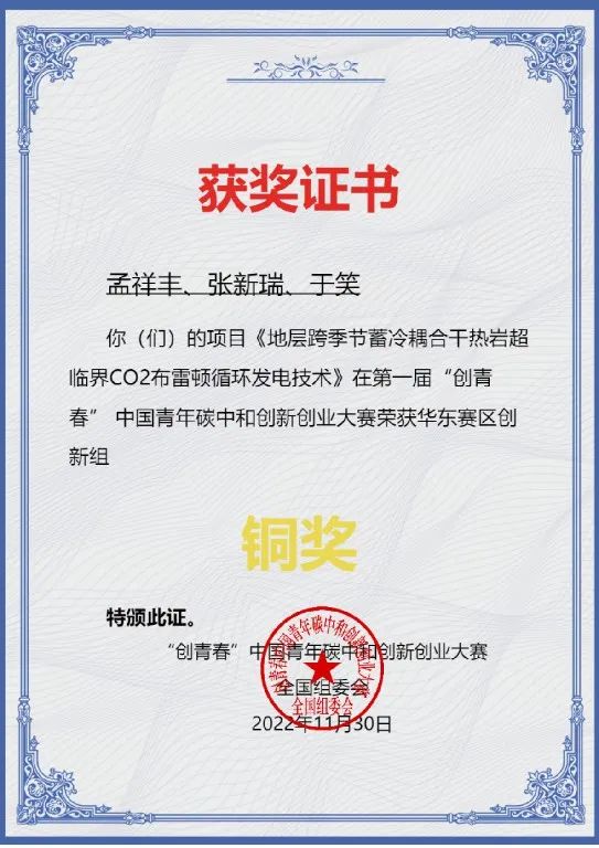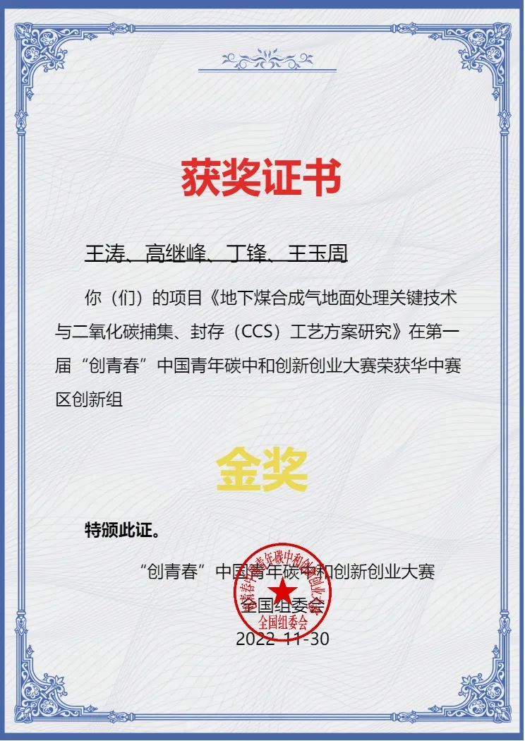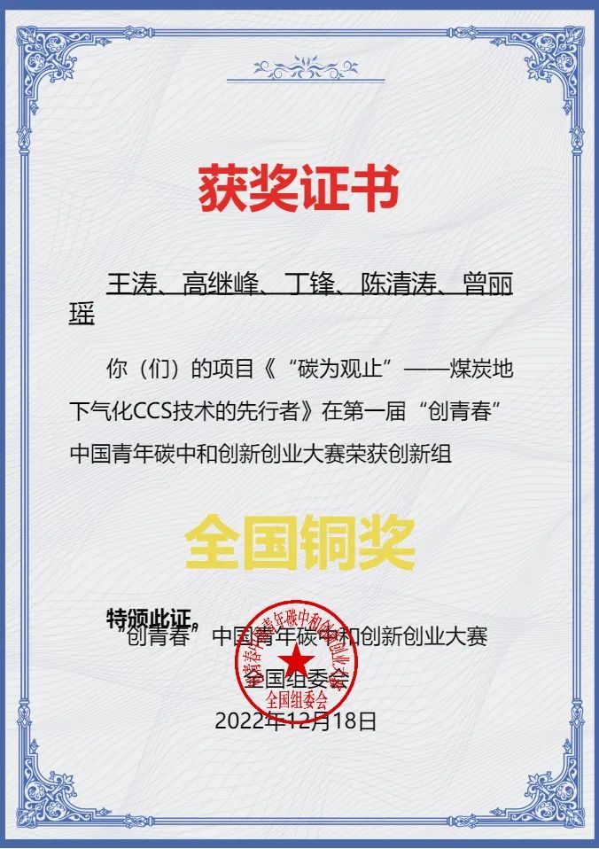 石油工程建设公司团委接到大赛通知后,该公司领导高度重视,安排团委与技术质量部深度沟通结合,制定详细参赛方案。筹备期间得到集团公司团委的大力支持和帮助,积极推动所属石油工程设计公司、中原设计公司两家单位青年参赛。两家设计单位精益求精,依靠多年来在碳中和领域的技术积累和持续探索,组织石油工程建设公司首席专家、高级专家等形成专家团队进行专项辅导,积极发挥博士后工作站作用,强化青年技术人员创新精神,刻苦钻研、精心准备、聚力攻关,完成申报课题18项,其中石油工程设计公司申报了《地层跨季节蓄冷耦合干热岩超临界二氧化碳布雷顿循环发电技术》等11项课题,中原设计公司申报了《“碳为观止”——煤炭地下气化CCS技术的先行者》等7项课题。参赛课题紧扣公司绿色低碳技术发展,全面展示了公司在CCUS、新能源等方面的技术成果,提高了企业美誉度和影响力。创新组:全国铜奖(华中赛区金奖)