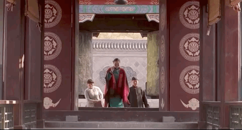 初登场,她一袭红衣,气场十足地俯视来人。