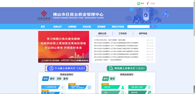 1、登录佛山市住房公积金管理中心网站(http://fsgjj.foshan.gov.cn/),点击“个人网上办事大厅(入口)”。