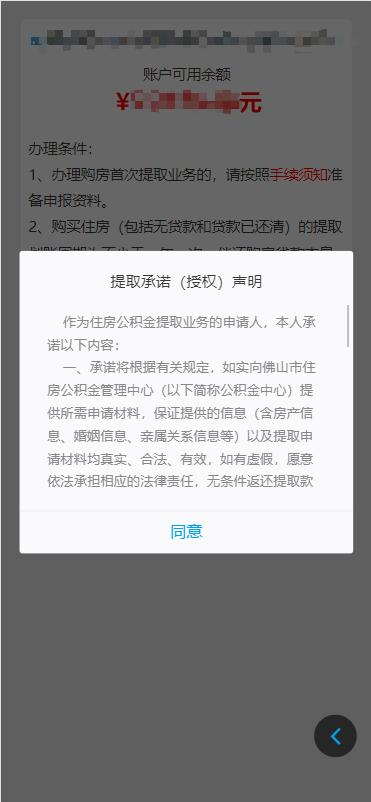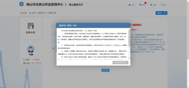 3、通过我要办理进入办理模块,点击个人提取办理,选择购房提取,点击下一步进入提取承诺(授权)声明对话框,仔细阅读《提取承诺(授权)声明》,点击同意后进入申报页面。