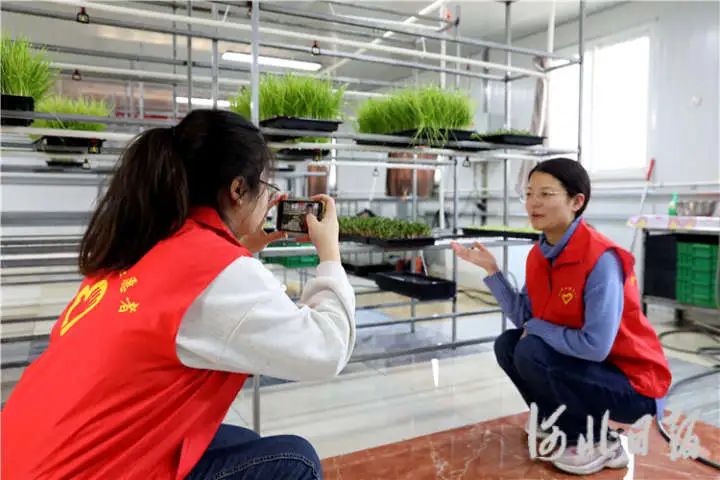 在调河头镇南郭庄村,鑫目农业合作社的芽苗菜无土栽培温室内,镇助农小分队正在拍摄产品宣传视频素材。通讯员高语婧摄