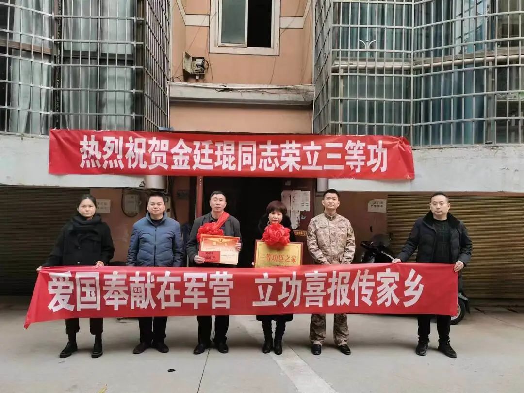 2月1日,桑植县人武部、县退役军人事务局先后来到澧源镇文明路社区、高家坪社区和老观潭社区,为荣立三等功的现役军人周洋、金延琨、王正的家属送去立功喜报。(时刻桑植)编辑丨杨婷