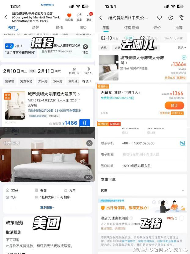 其次,这些平台在预定单退款环节也有一定差别。在携程和去哪儿预定2月10日当晚入住该酒店,支持在当地时间某段时间前免费取消,但是飞猪就不可以免费取消,可以在其平台渠道选购62元一份的酒店无理由取消险,未入住可以获赔房费损失的90%,美团则是在预定后无法更改或取消。