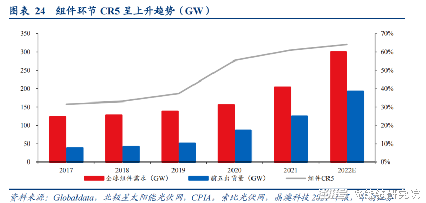 其次,从组件环节集中度来看,近年来呈现逐年上升趋势。根据统计,2021年前五家组件企业合计出货124.6GW,约占全球组件需求的61.1%,同比+5.7pct;预计2022年CR5为60%-68%。