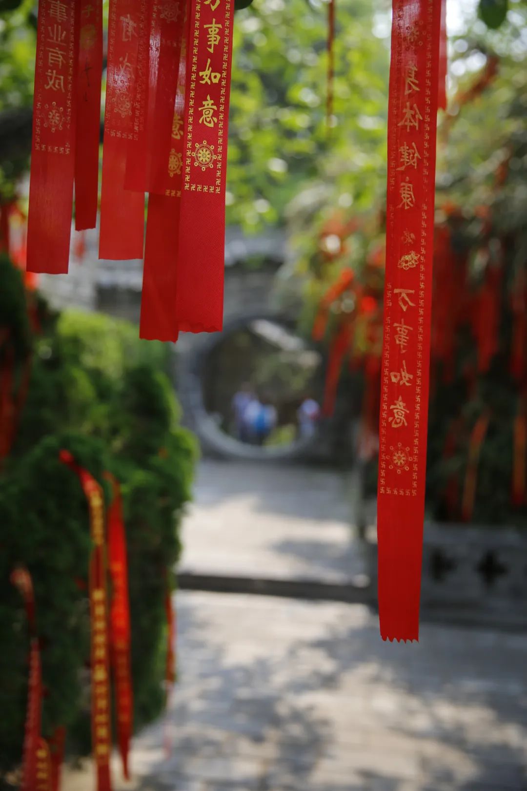 写有美好愿望的红丝带系在楼阁间的古树上
