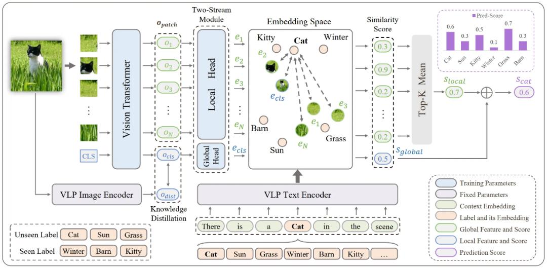 MKT 总体框图如图 2. 所示,主要包含 Vision Transformer、双流模块(Two-Stream Module)、图文预训练(VLP)Image/Text Encoder 等模块。其中,Vision Transformer 是提取图片语义特征的 Backbone 网络。由于 CLIP 具有强大的图文匹配能力,研究者采用 CLIP 的图像和文本编码器作为图文模型多模态知识的迁移来源。标签 Embedding 由 CLIP 文本编码器产生,并通过提示学习进一步更新。研究者引入知识蒸馏来促进图像和文本 Embedding 的对齐。