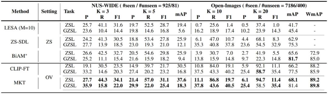 MKT 在 NUS-WIDE 和 Open Images 公开数据集上显著超过了以往的 ML-ZSL 方法,在 Open Vocabulary 多标签分类任务上达到 SOTA。