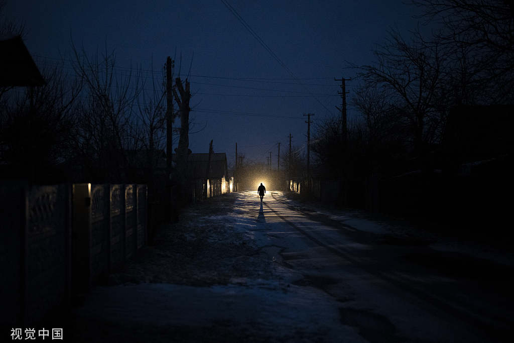 当地时间2023年2月1日,乌克兰Kolychivka,停电期间,一名男子在汽车前灯前行走。视觉中国 图