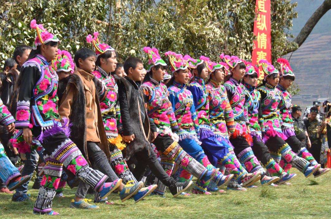 节日当天,彝家姑娘就会打扮一新,带着平日绣制好的多套服装,会聚到直苴村参加一年一度的赛装盛会。在芦笙的伴奏中,一队队依次上场,老人、少女、儿童翩翩起舞,和着悠扬的葫芦笙旋律,跳起传统的彝族“三跺脚”,以优美的舞姿展示自己亲手刺绣和缝制的服饰。灿烂别致而不同寻常的服饰美,亮丽而不艳俗的色彩美,散发出无穷的魅力,慕名而来的宾客都沉浸在赛装场面中。