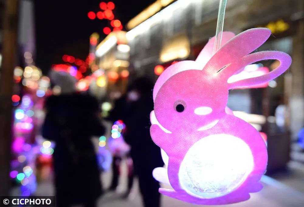↑2023年1月26日在河北省邯郸市回车巷历史文化街区拍摄的兔子灯笼。CICPHOTO/郝群英 摄