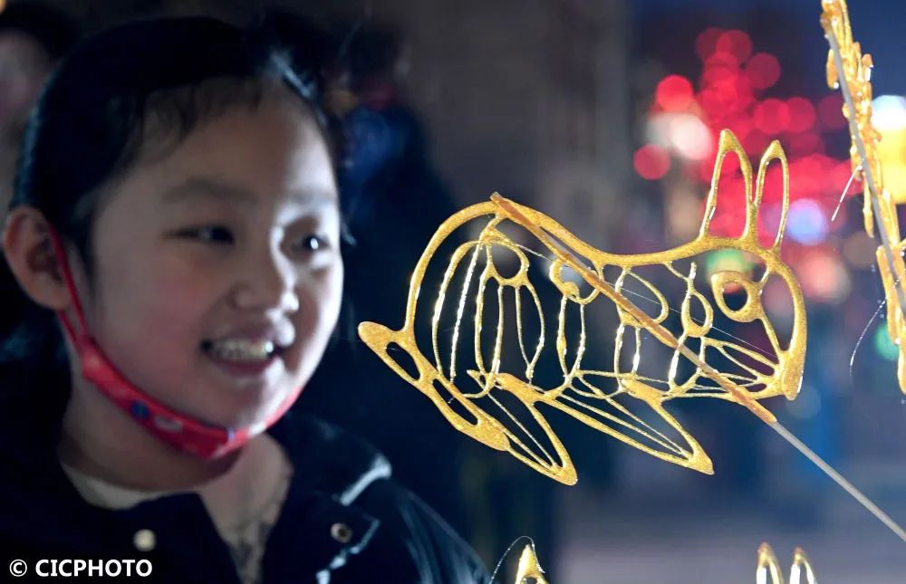 ↑2023年1月26日,在河北省邯郸市回车巷历史文化街区,一名小朋友观看“兔子”糖画。CICPHOTO/郝群英 摄