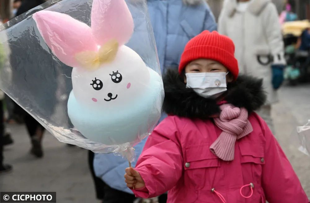 ↑2023年1月26日,在河北省邯郸市回车巷历史文化街区,一名小朋友展示“兔子”棉花糖。CICPHOTO/郝群英 摄