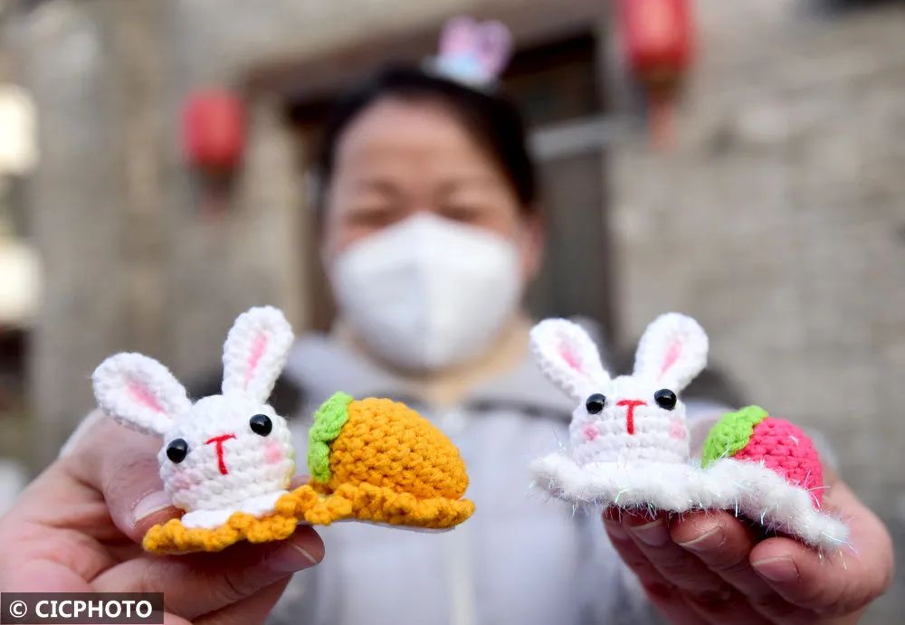↑2023年1月26日,在河北省邯郸市回车巷历史文化街区,一位市民展示“兔子”手工发卡。CICPHOTO/郝群英 摄