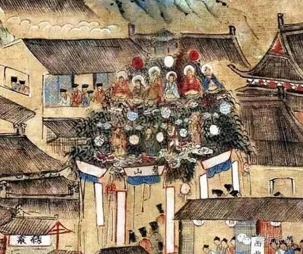 ▲ 《南都繁会景物图》中的鳌山灯鳌山灯是以木材等物搭建出假山状,上有苍岩翠柏,供有天地全神、风神和火神之位。装饰以花灯,伴有表演。灯里面有的放置灯烛,有的放置烟花,所悬挂的各样花灯,绚丽多彩(图源:www.sohu.com)