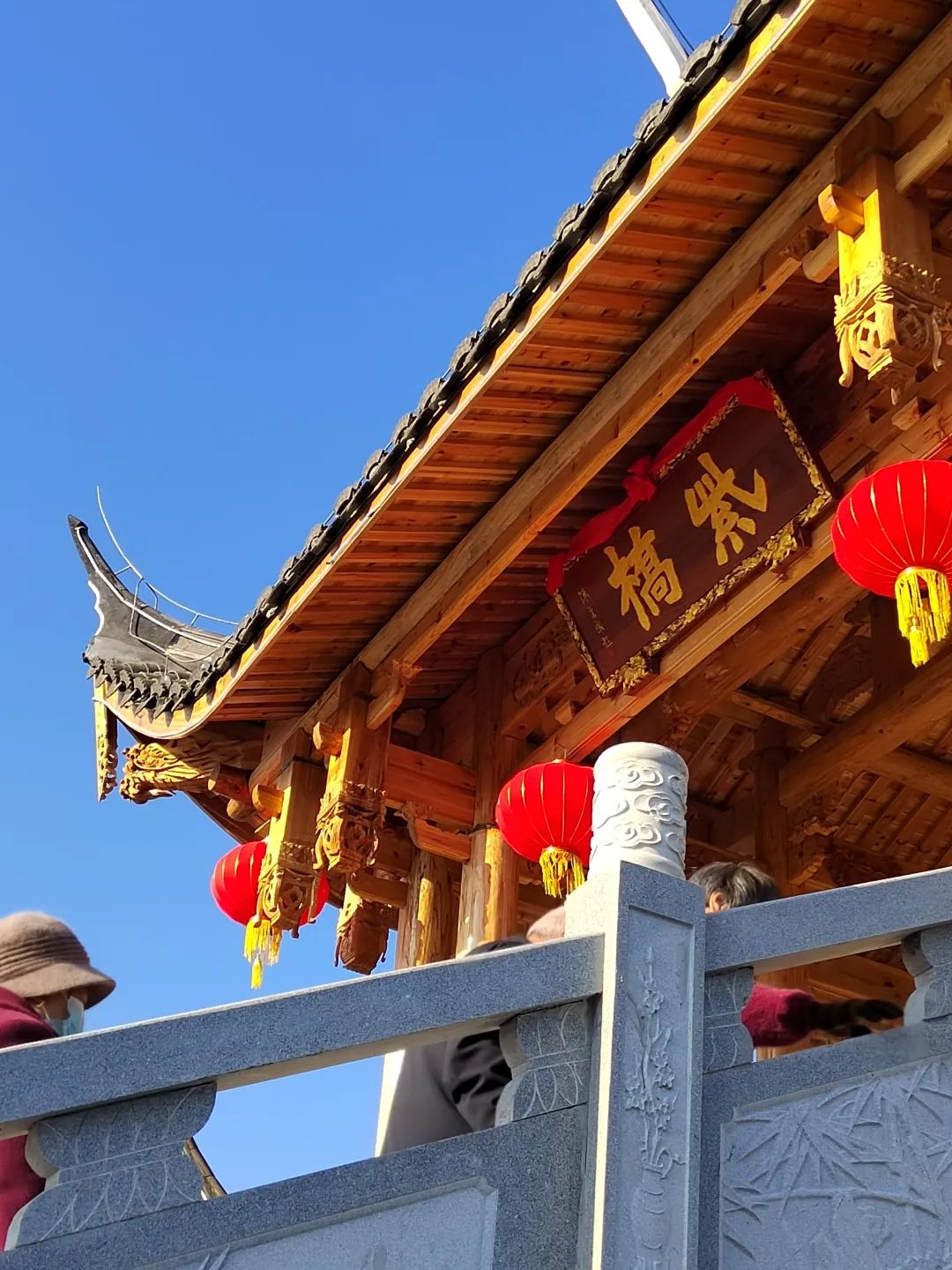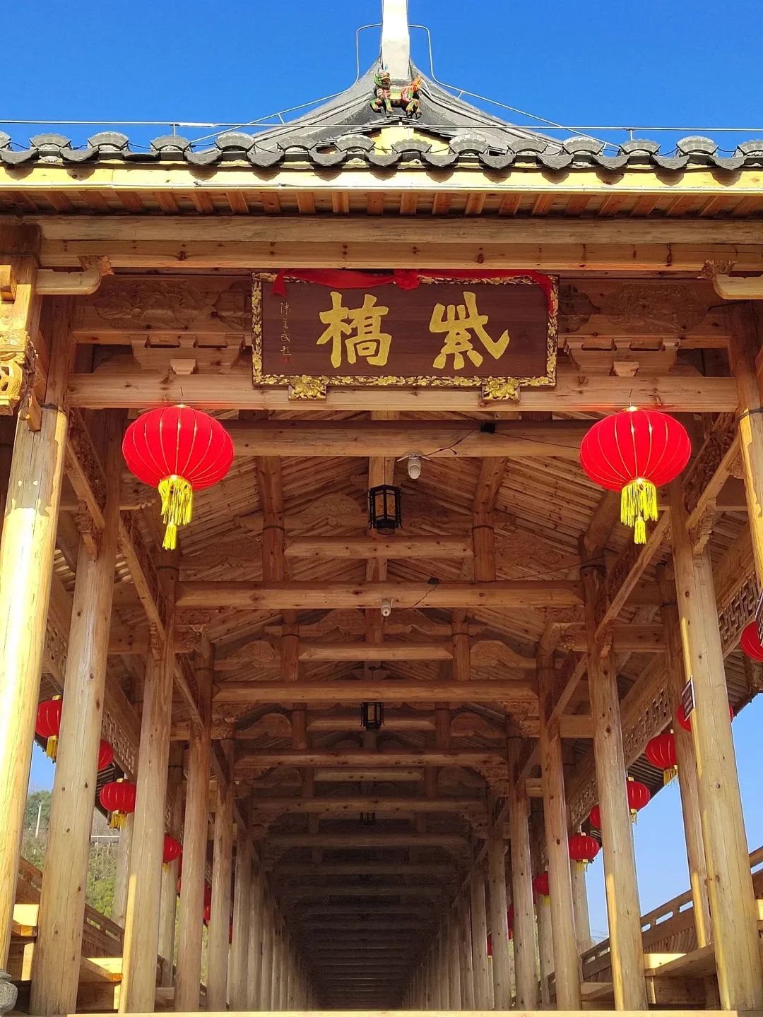 我带着她慢慢走,慢慢看,不仅看石头栏杆上的瑞草花卉的浮雕,更带她仰头看左右两边横梁上各26块的木雕,然后从第一个的“开元置县”讲解到到最后一个的“移民新城”。对于梁上这些标注出来的古田的重大事件、重要人物、重点景点,我希望我的孩子能多了解一些,毕竟,这里是她的出生地和生产地——家乡作为一个人的精神脐带,源源不断地为他(她)输送着精气神,给他们以慰藉,以温暖,和难以言说的安定祥和……