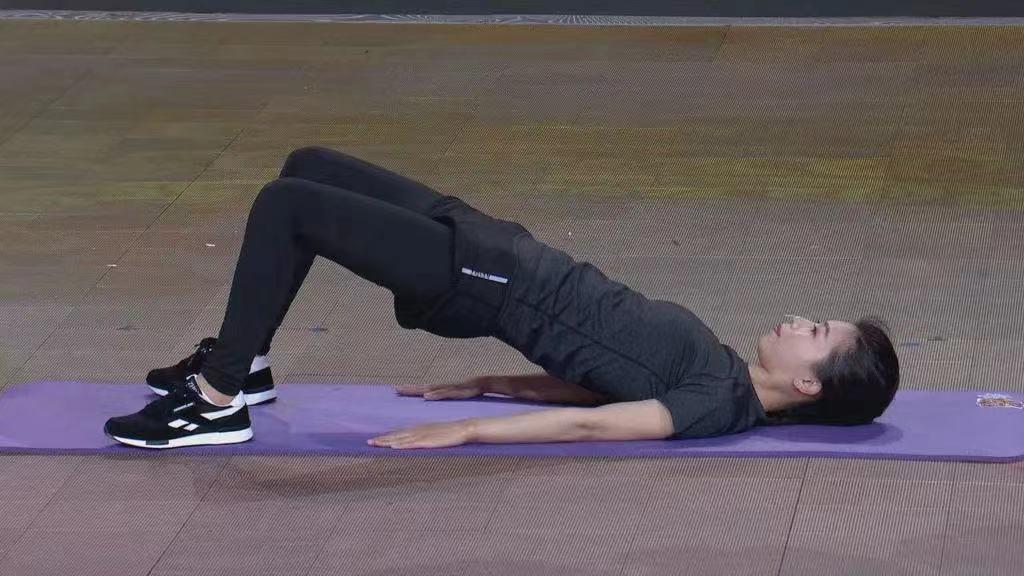 勾脚尖,用足跟着地支撑,这样可以更明显地刺激臀肌发力;另外在桥式运动支撑的情况下,腰背部、大腿后侧等肌群也在协调发力。4